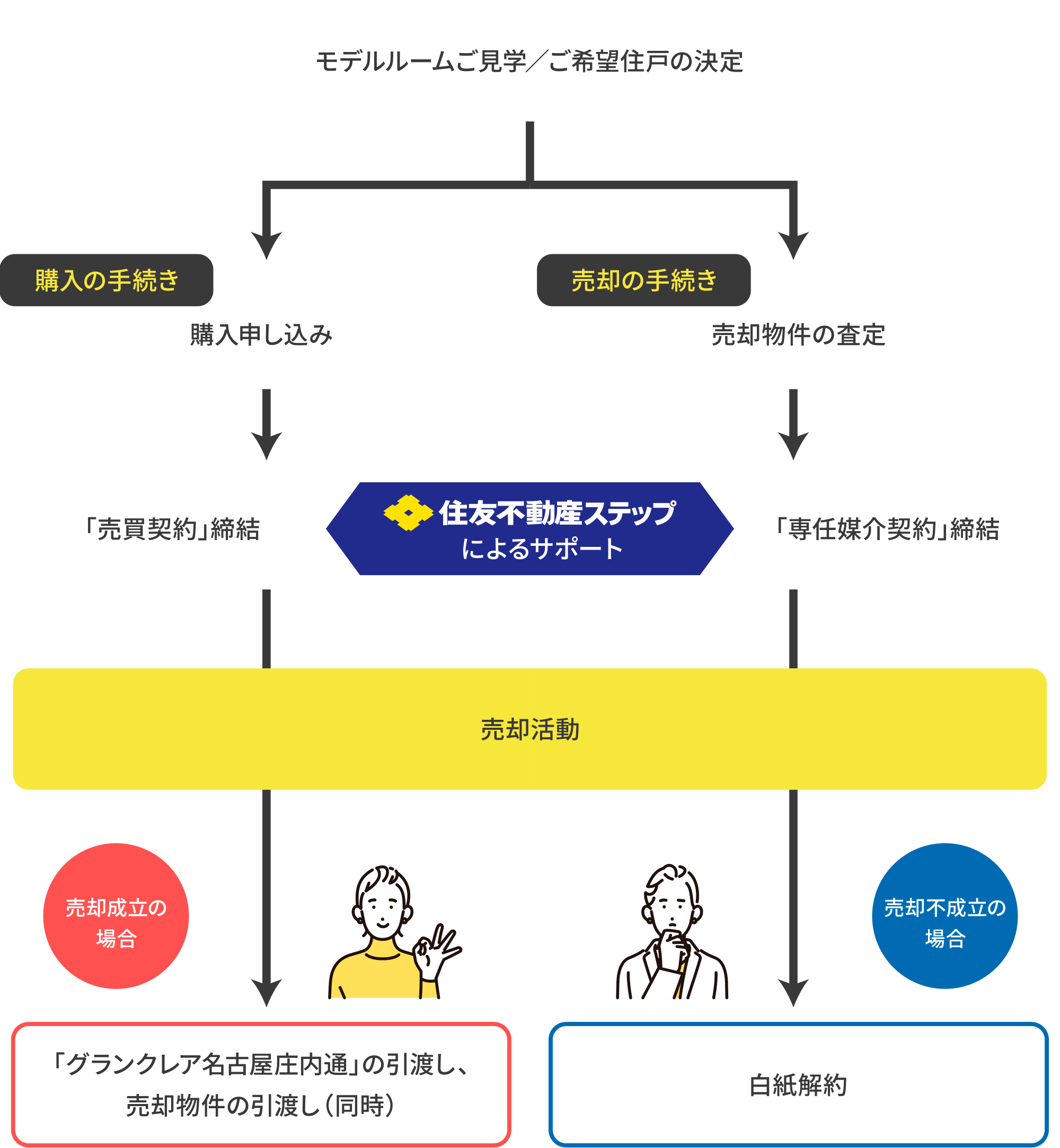 Q 売買契約締結後は、どんなスケジュールになるのか?   A 売買契約締結時に、専任媒介契約を締結いただきます。3ヶ月以内の売却活動を行い、その後、売却物件とグランクレア名古屋庄内通の引渡しを同時に行います。
