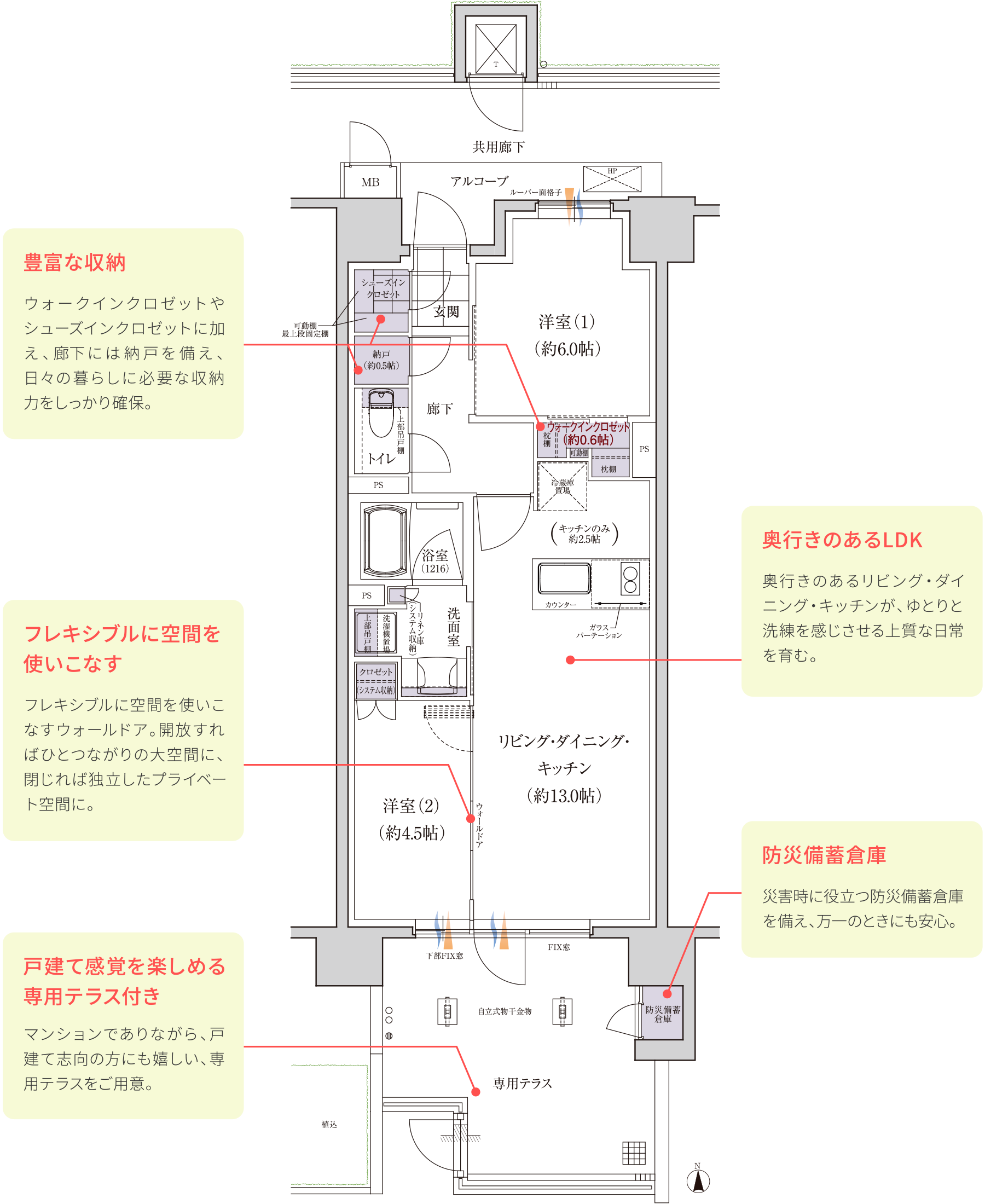 上り下りの負担がなくなる詳しくはこちら 2階への移動がないワンフロア生活で、階段の上り下りもなく、体への負担をやさしく軽減。 53.05㎡〜86.70㎡の豊富なプランをご用意